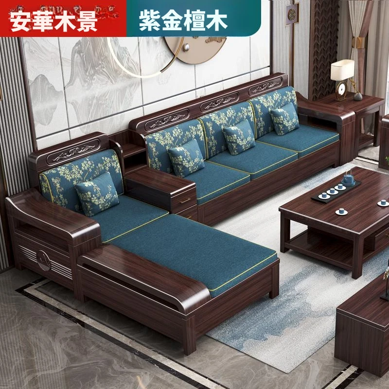 新疆送料無料!紫金檀木の無垢材ソファセット - モダンミニマリストスタイル、冬夏兼用の新中式デザイン。収納機能付きで、居心地抜群のリビング空間を演出!