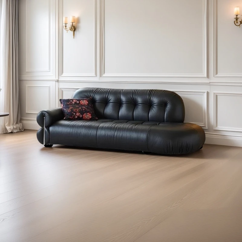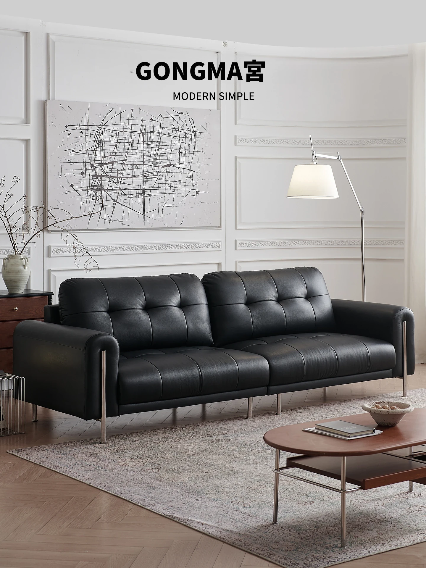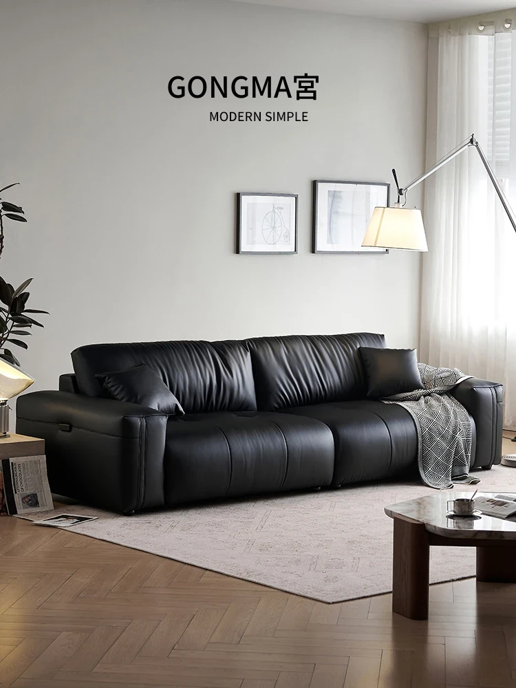 宮瑪/豆包本革ミニマリストブラックソファー - ヴィンテージイタリアンファーストレザー使用、リビングルームに最適なピクセルデザイン。小型住宅にもぴったり!おしゃれで快適な空間を演出します。