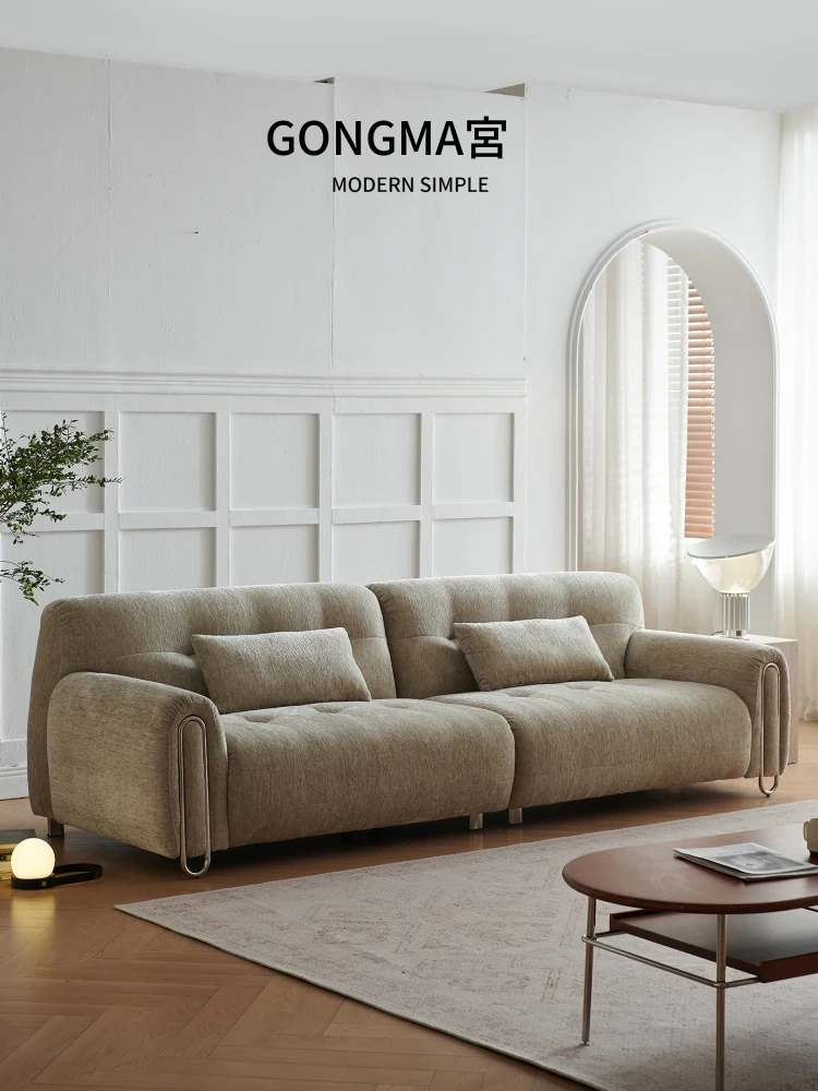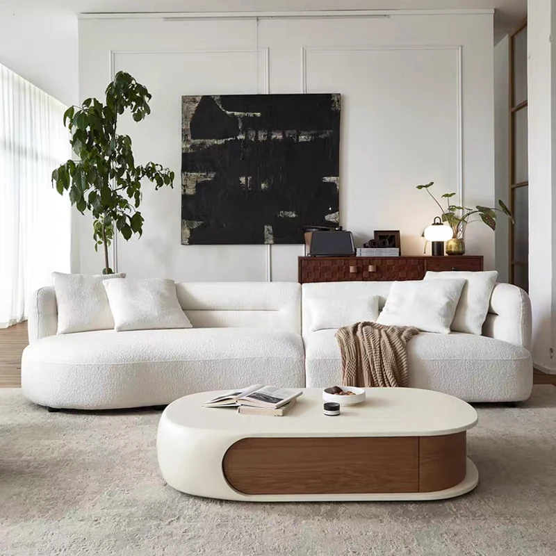 イタリアンミニマリズムの曲線デザイン、侘寂風の現代的な接待用ソファ。クリーム色のシンプルなファブリックで、洗練された空間を演出します。おしゃれで機能的なリビングの必需品!