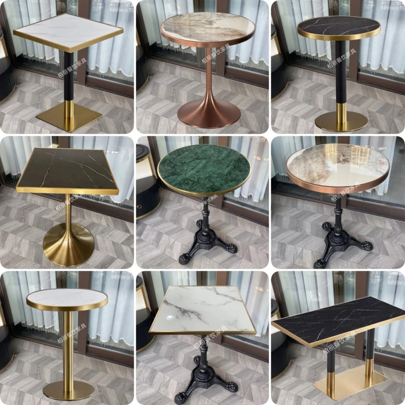 カフェ・レストラン向け 高級感溢れる金縁岩板テーブル!大理石の円形デザインで、スイーツやミルクティーにも最適。ホテルや洽談にぴったりのスタイリッシュなダイニングテーブルセット。