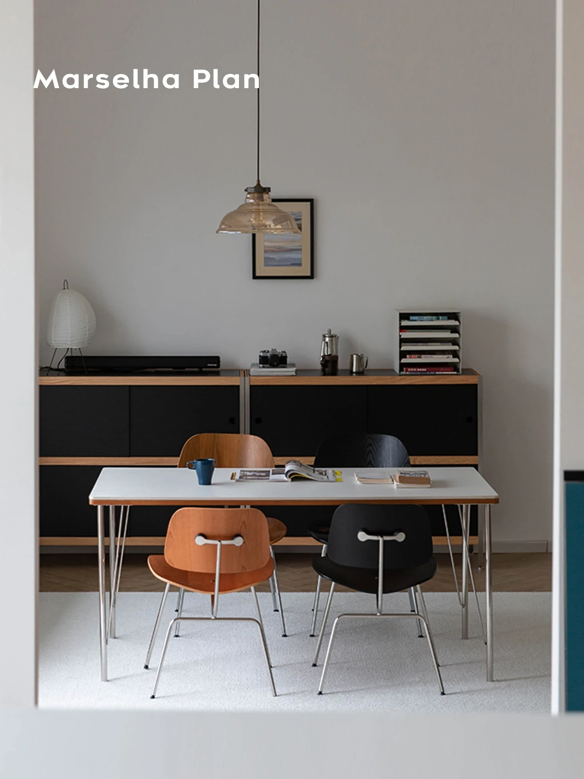 "Marseille Plan: Nordic Bauhaus Solid Wood Thickened Rock Plate Stainless Steel Square Dining Table" - Elevate your dining experience with this stylish and durable table, perfect for modern homes.