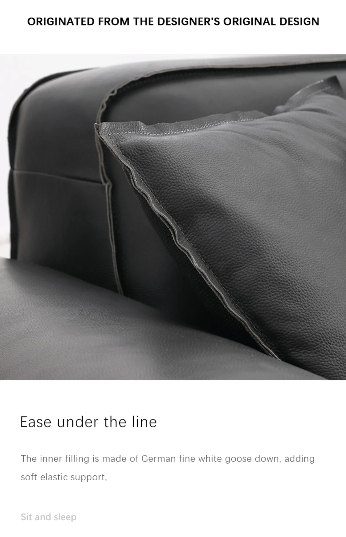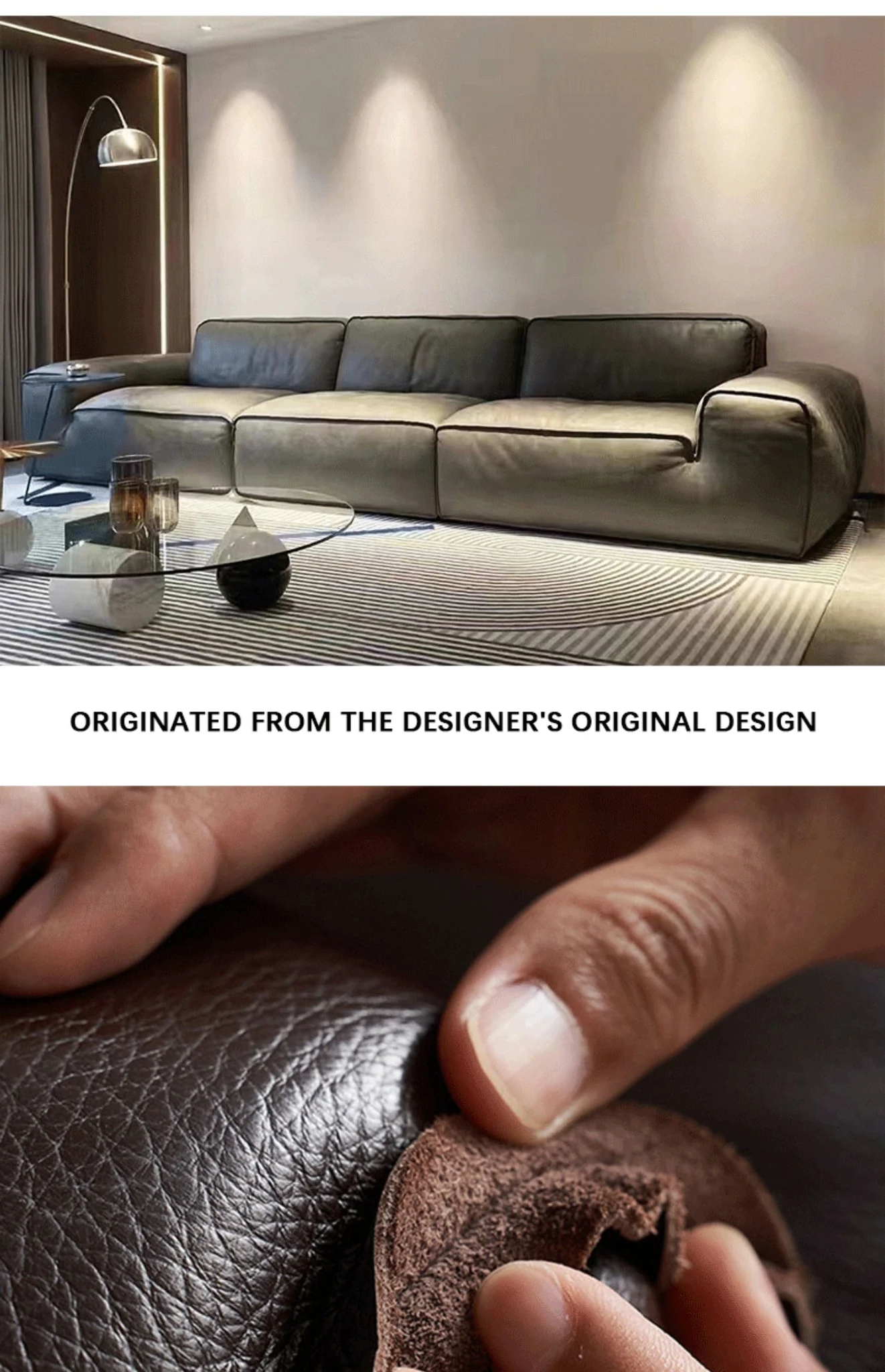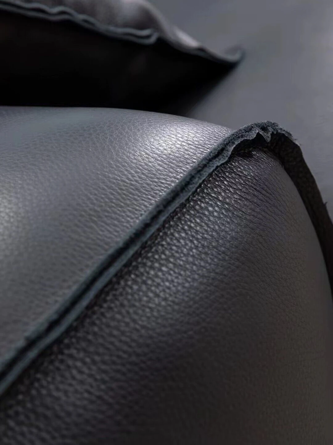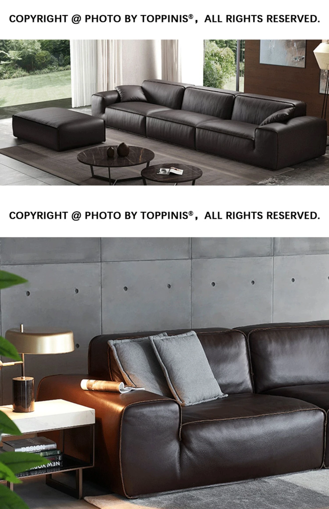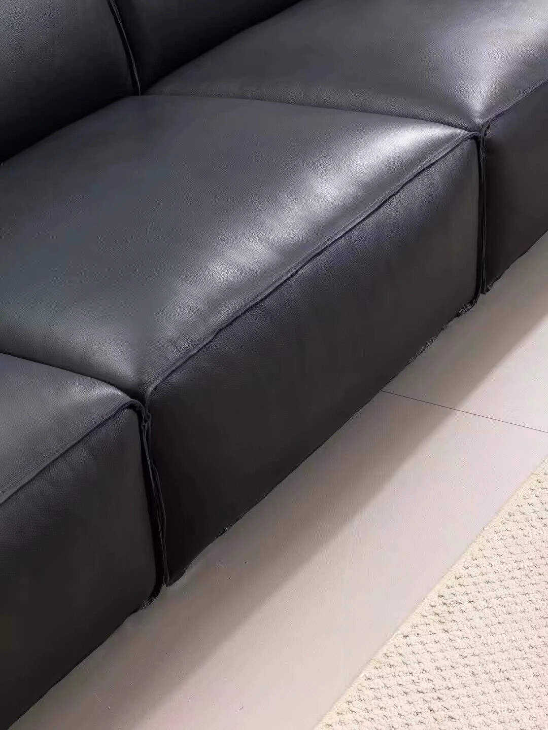 Modern Minimalist Large Black Cow Leather Sofa with Tofu Block Design for Small to Medium Living Rooms - Top Grain Genuine Leather, Perfect for Stylish Comfort