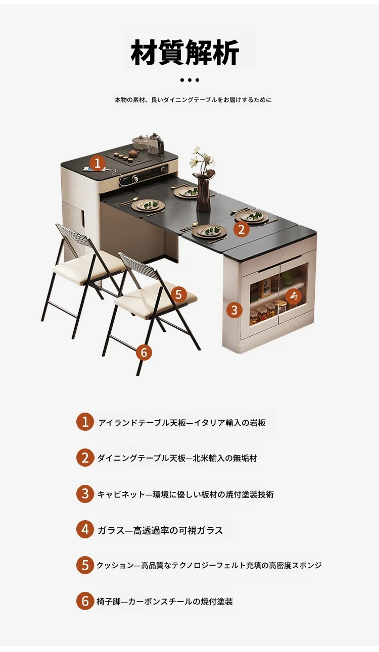 高級フラッグシップモデル伸縮アイランドテーブル+ A型チェア*6(お茶なし)