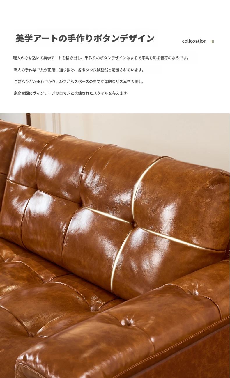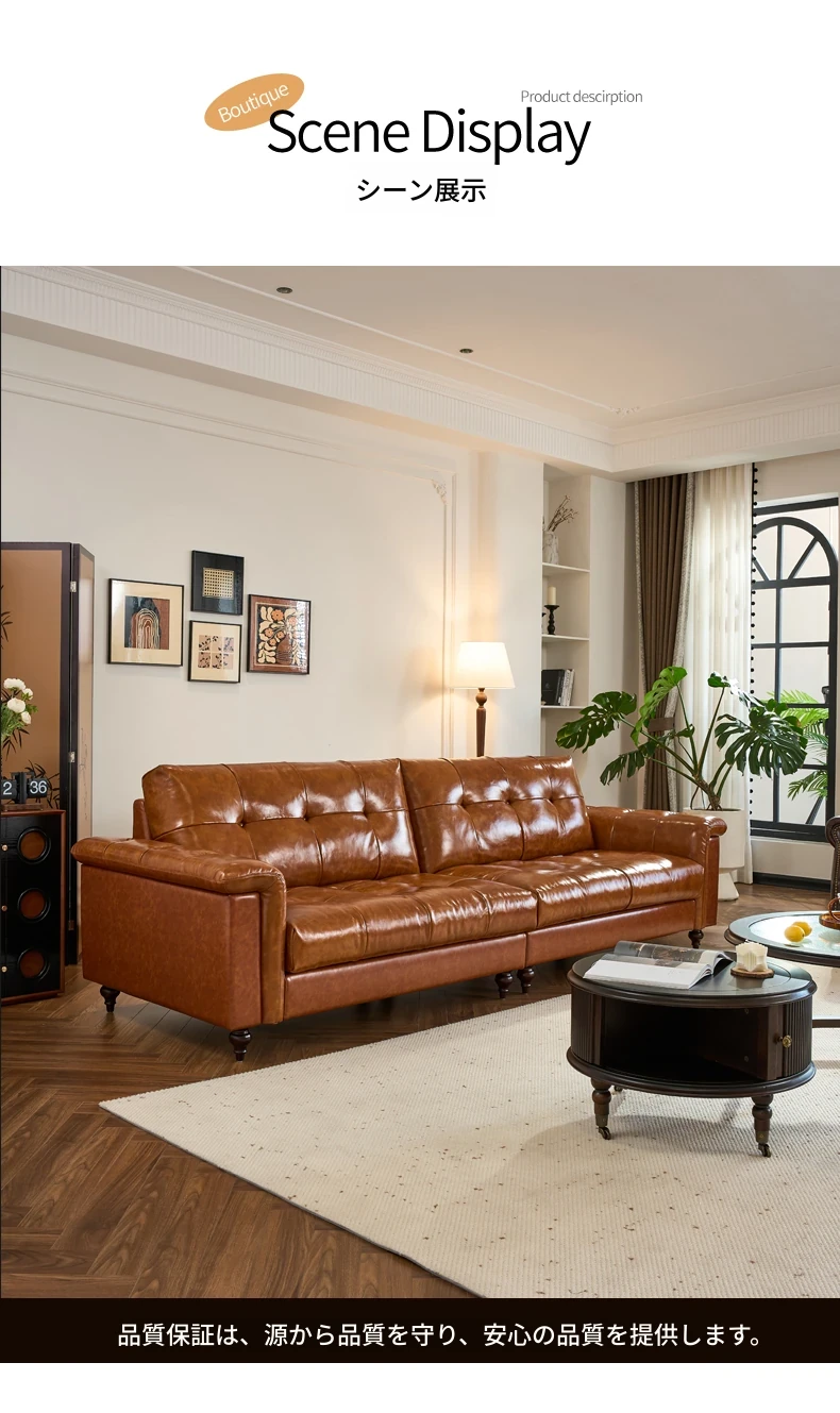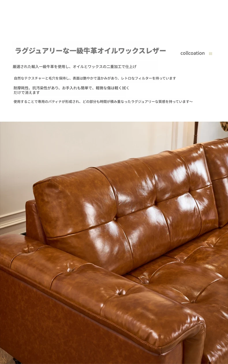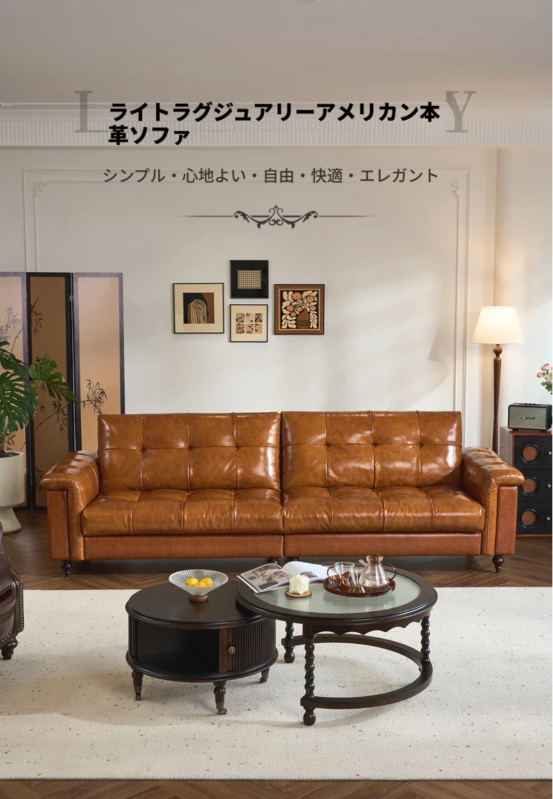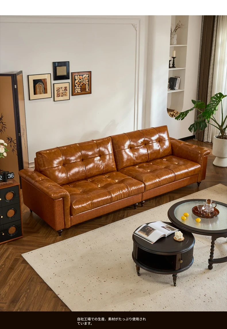 星雲本革ソファー 中古風アメリカンデザイン 高品質トップグレインオイルワックスレザー ブラウン フレンチビンテージ ダウンクッション付き リビングルームに最適なスリムデザイン