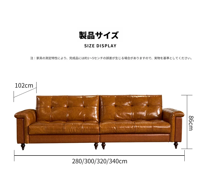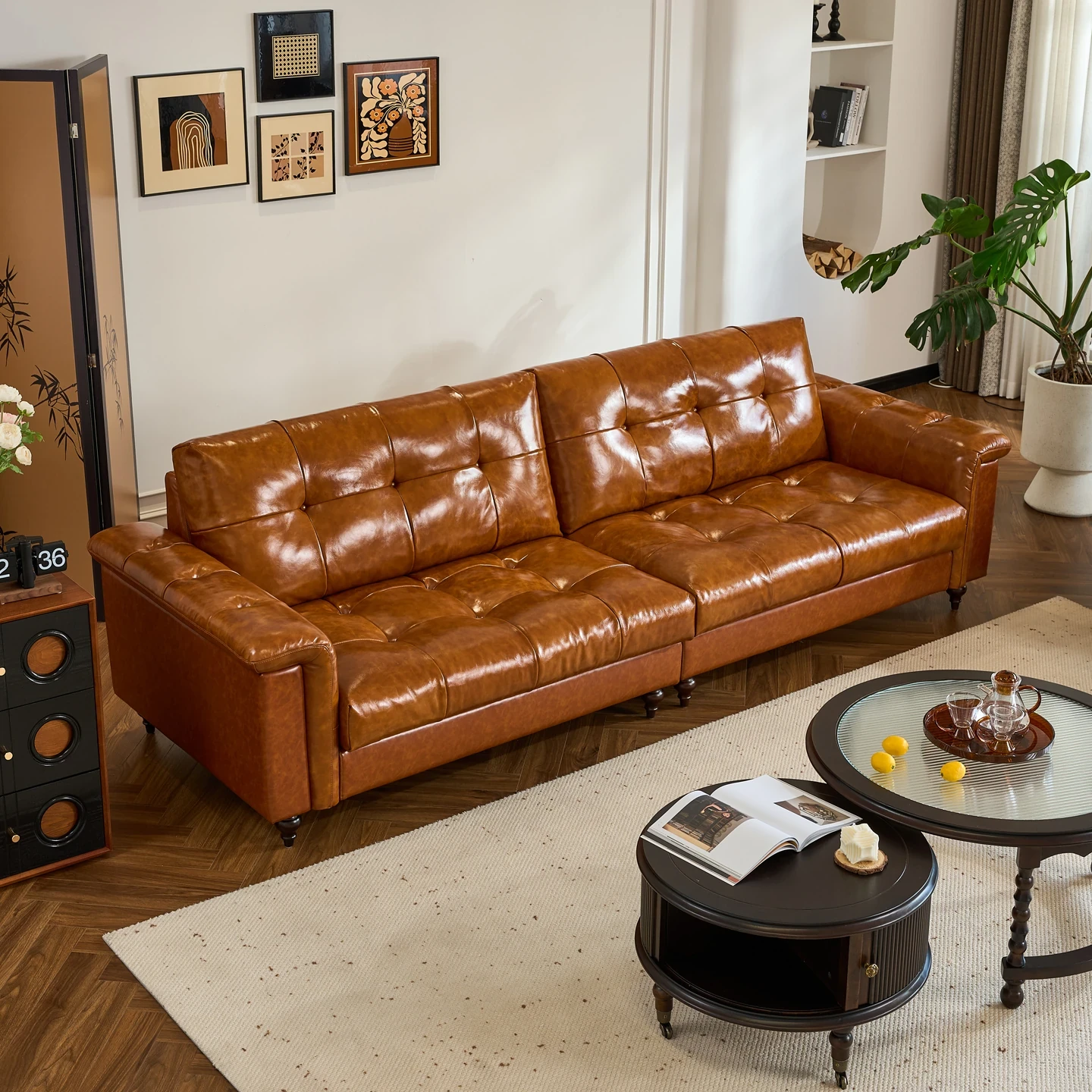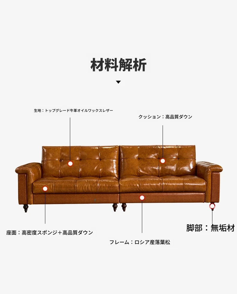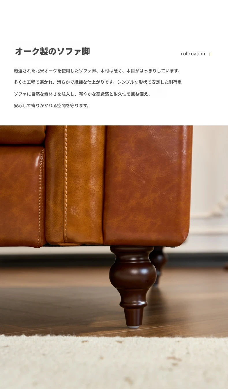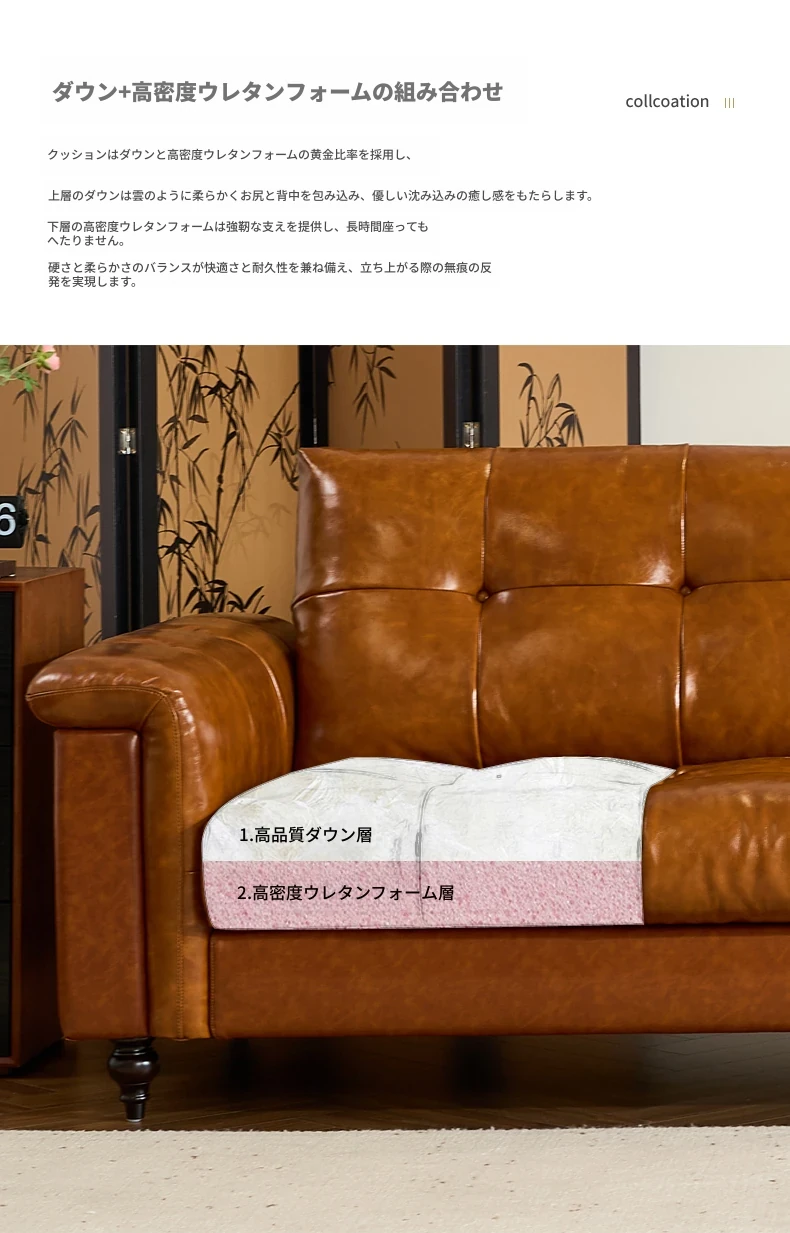 星雲本革ソファー 中古風アメリカンデザイン 高品質トップグレインオイルワックスレザー ブラウン フレンチビンテージ ダウンクッション付き リビングルームに最適なスリムデザイン