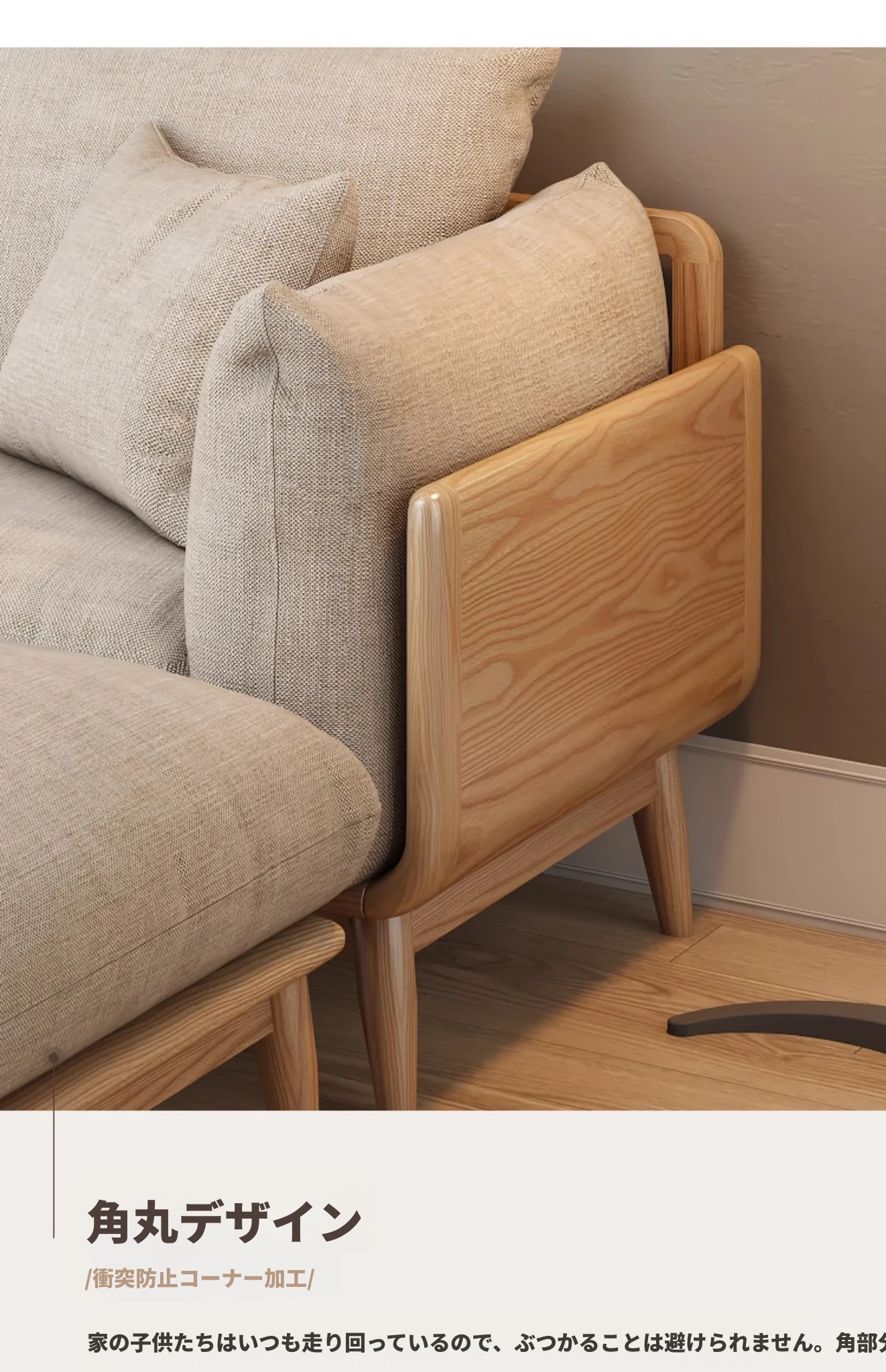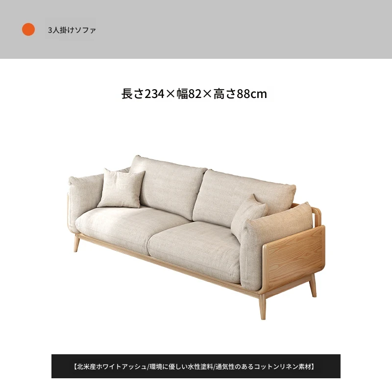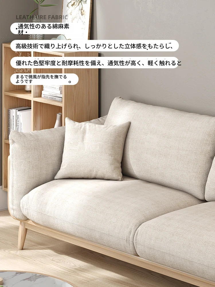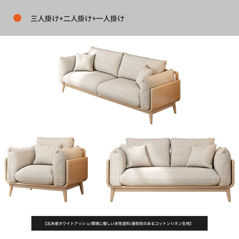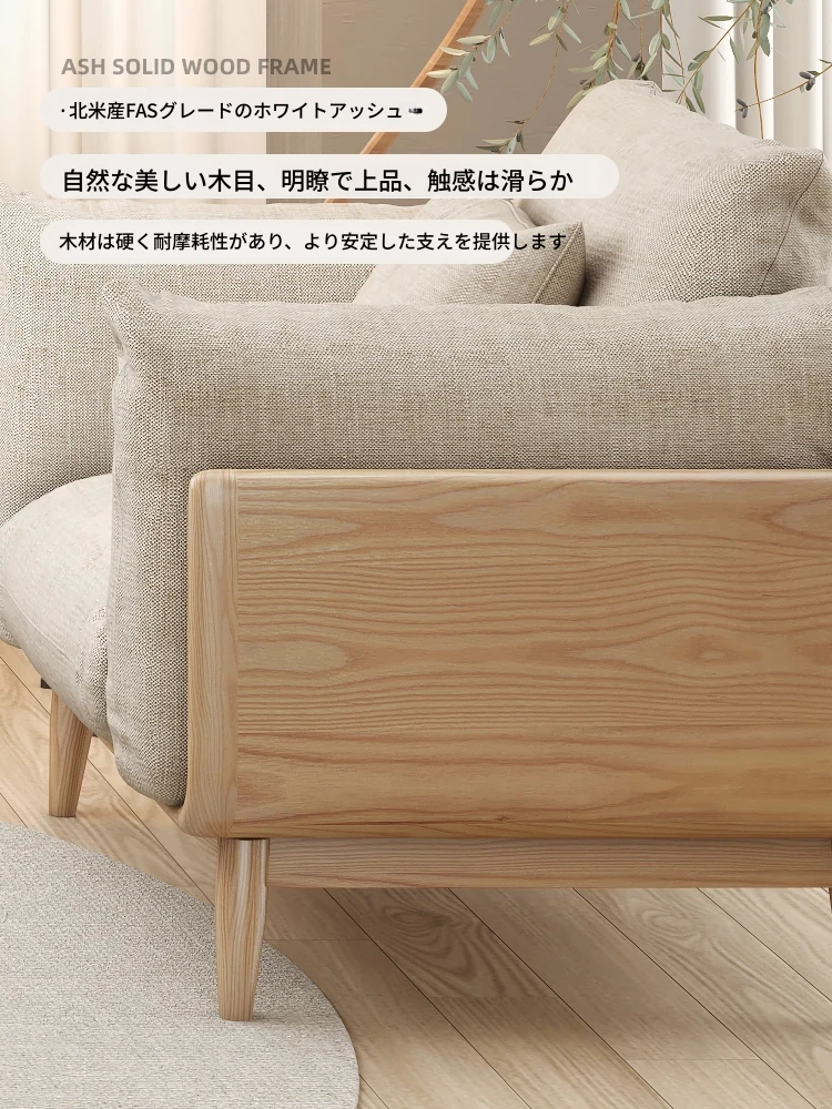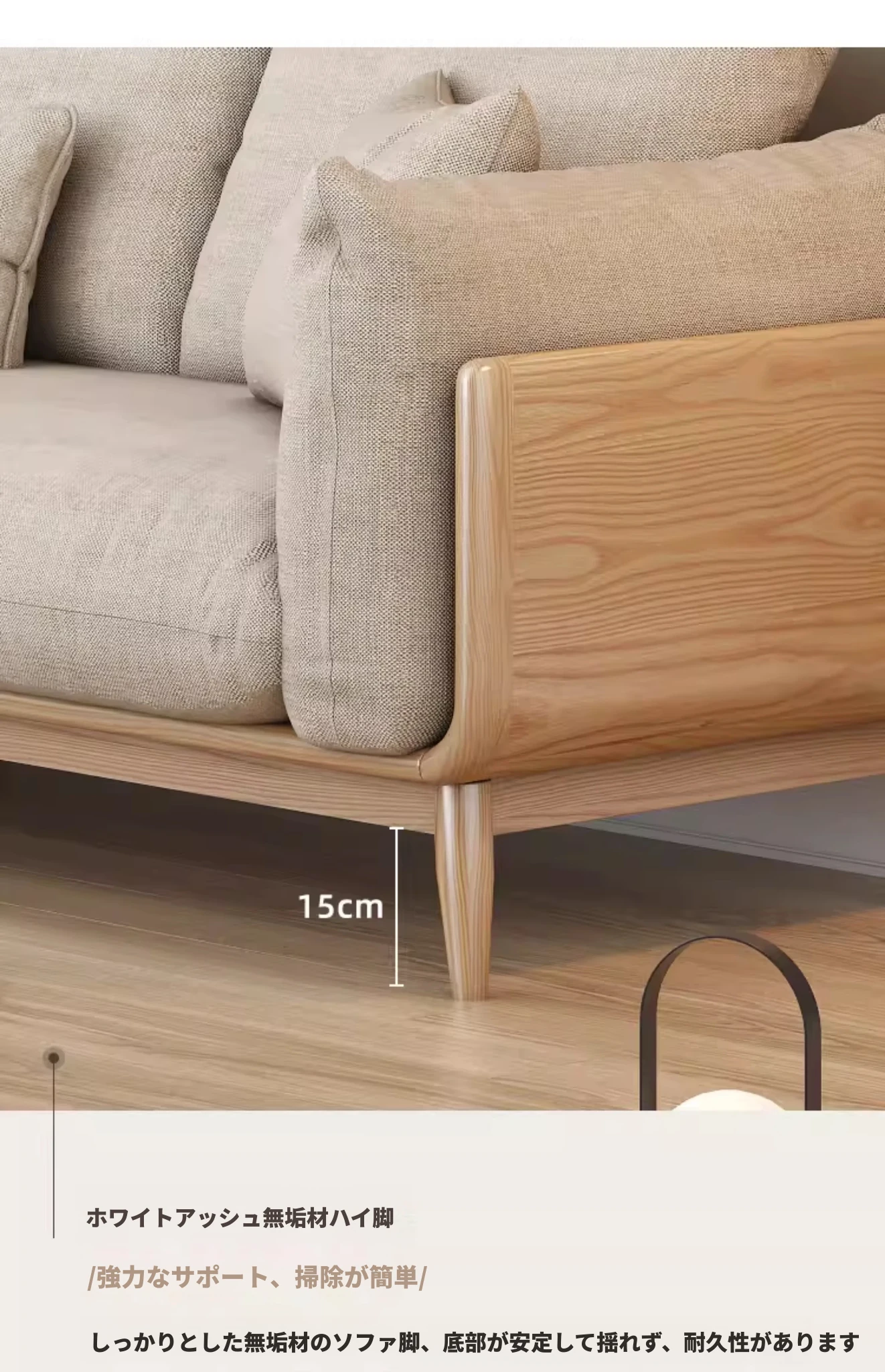 北欧スタイルの天然木製ファブリックソファ | モダンミニマリズム | テクノロジー布使用 | 小型リビングに最適 | ホワイトアッシュ材の3人掛けコンビネーションソファ