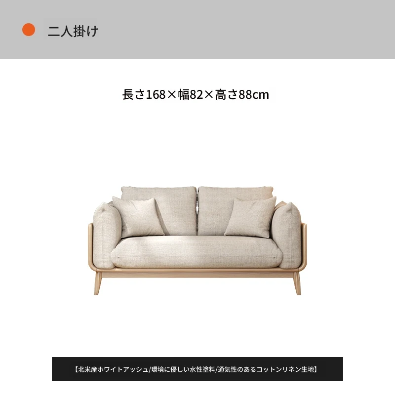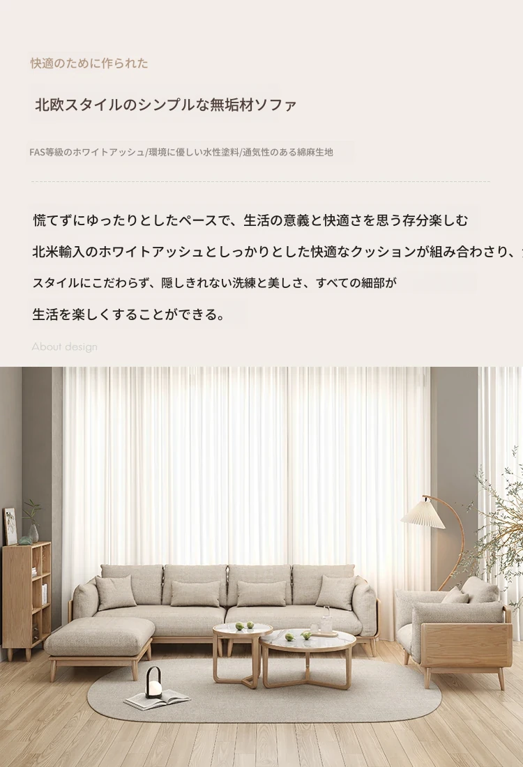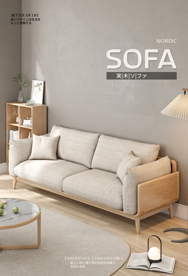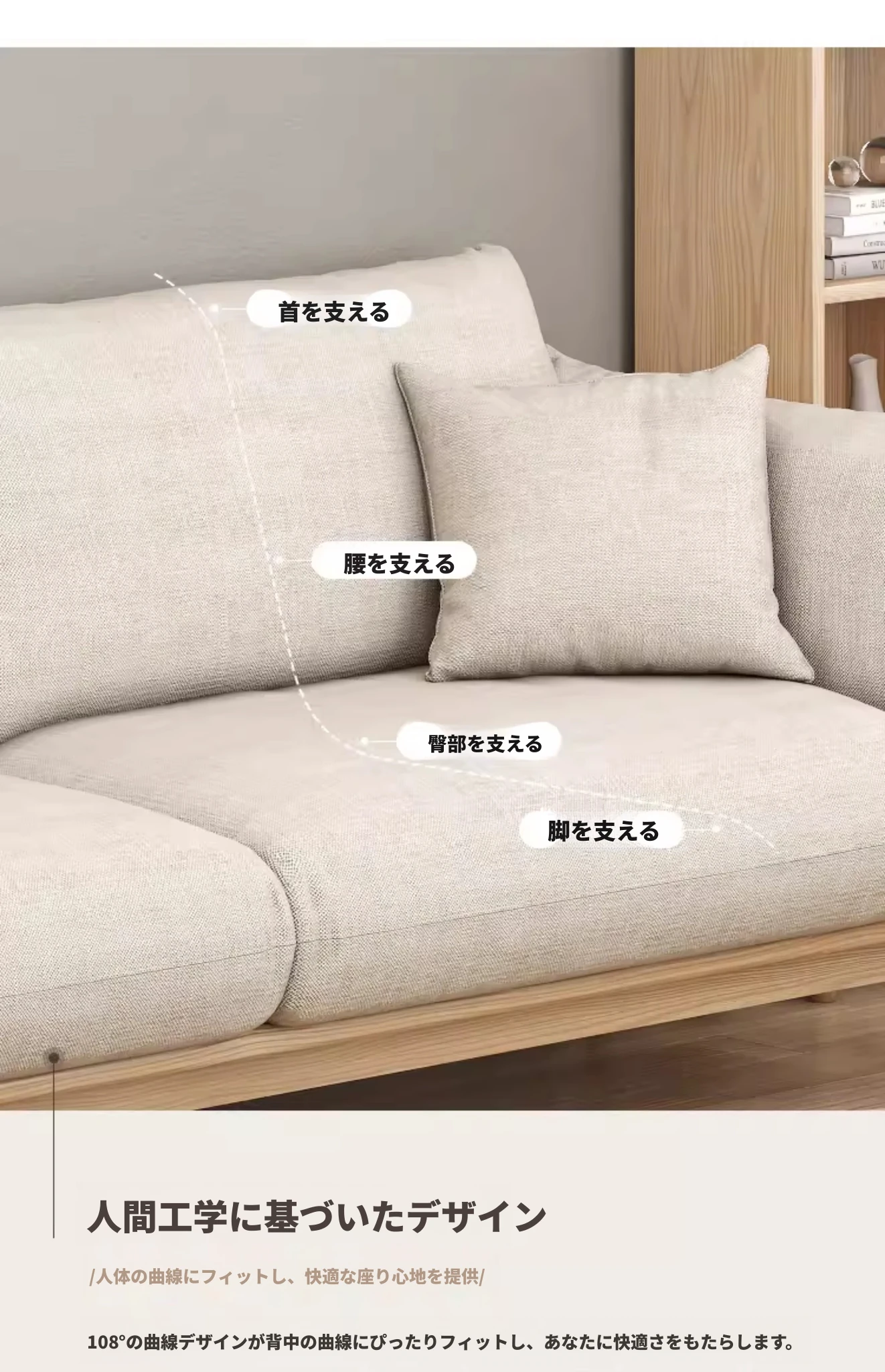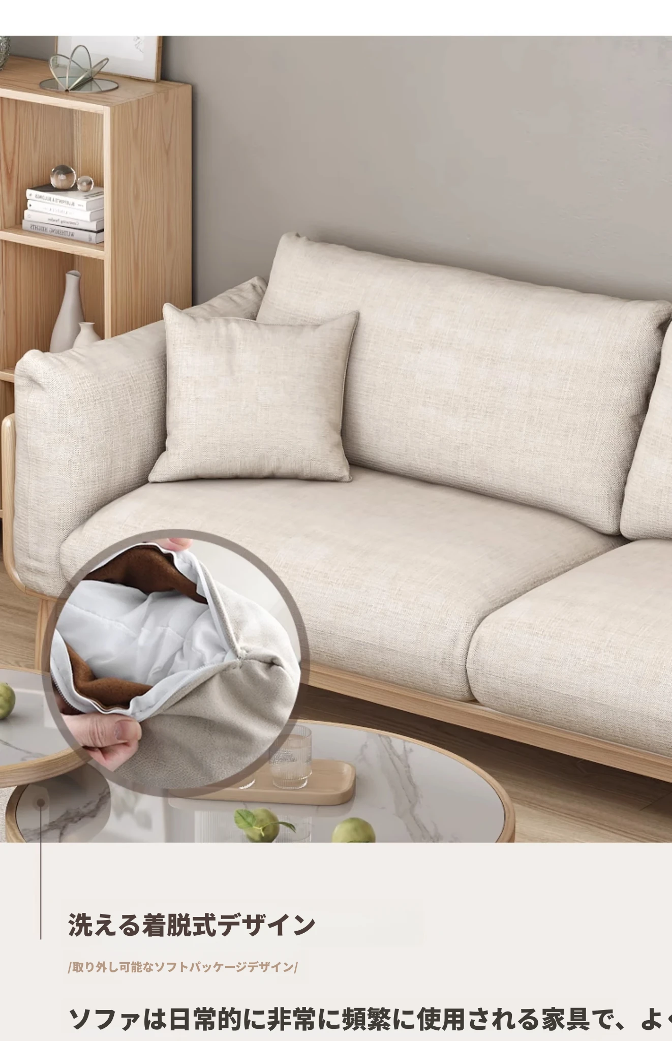 北欧スタイルの天然木製ファブリックソファ | モダンミニマリズム | テクノロジー布使用 | 小型リビングに最適 | ホワイトアッシュ材の3人掛けコンビネーションソファ