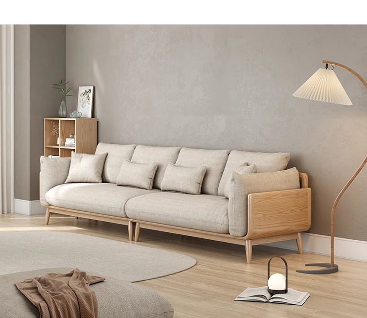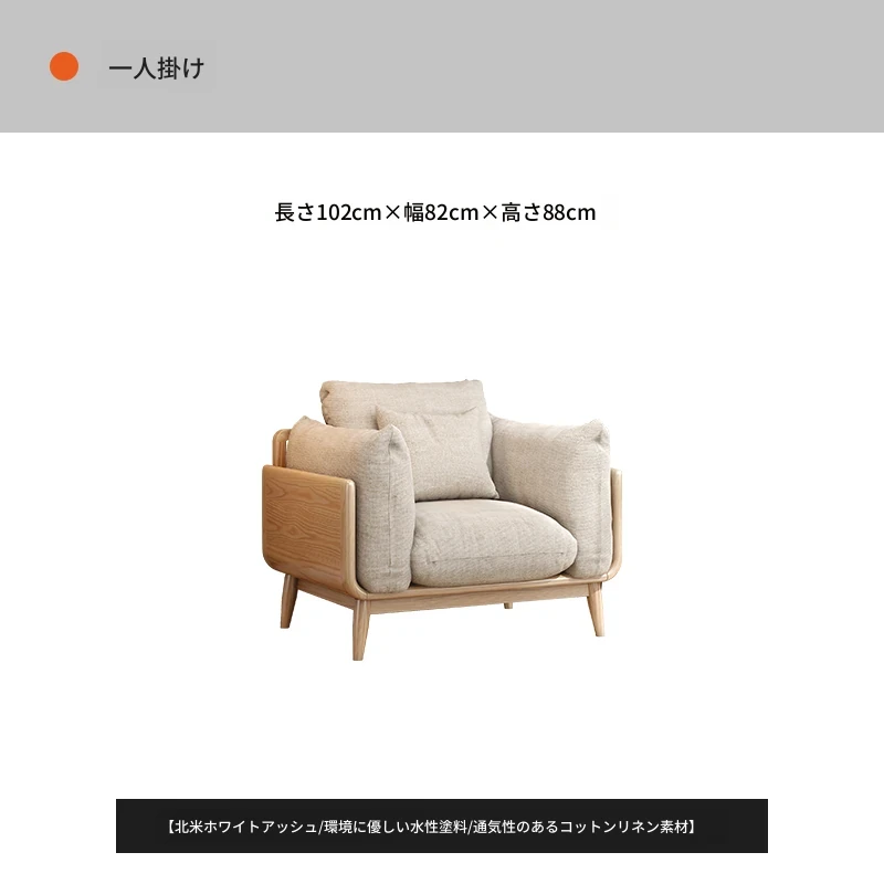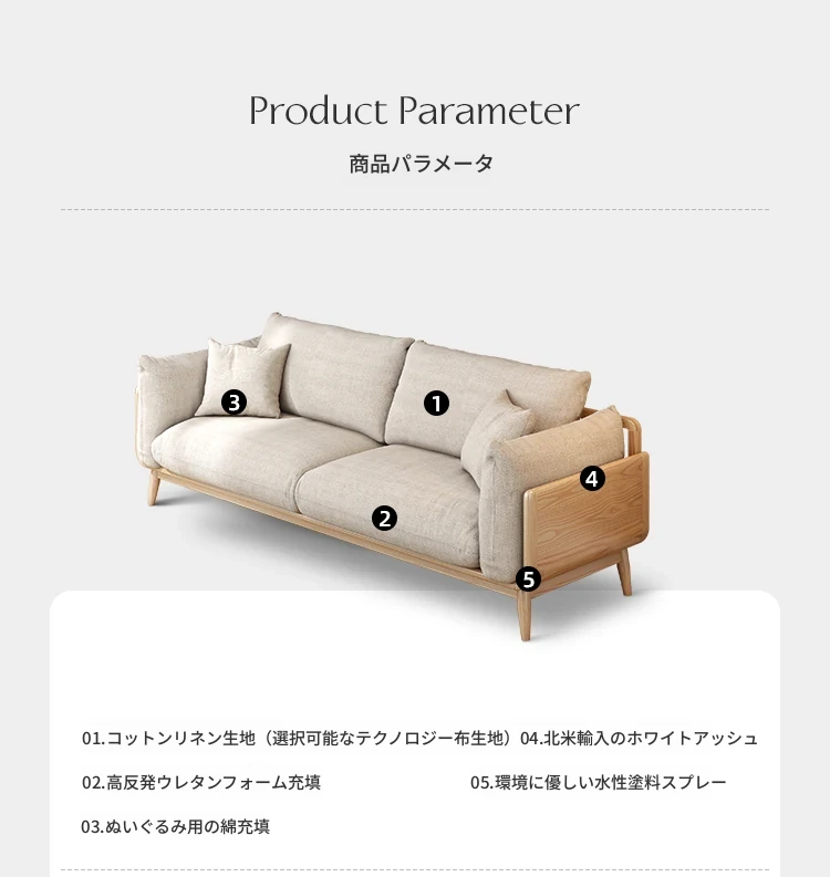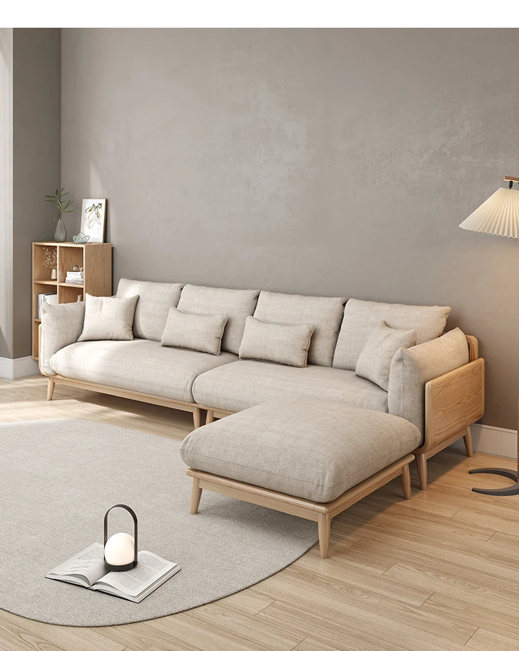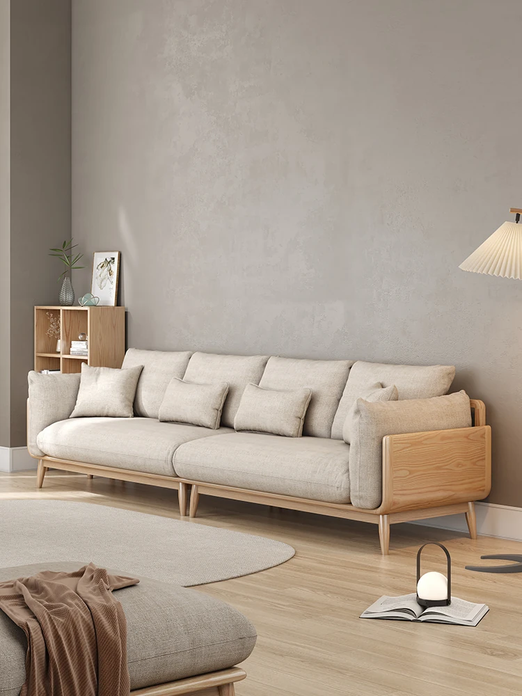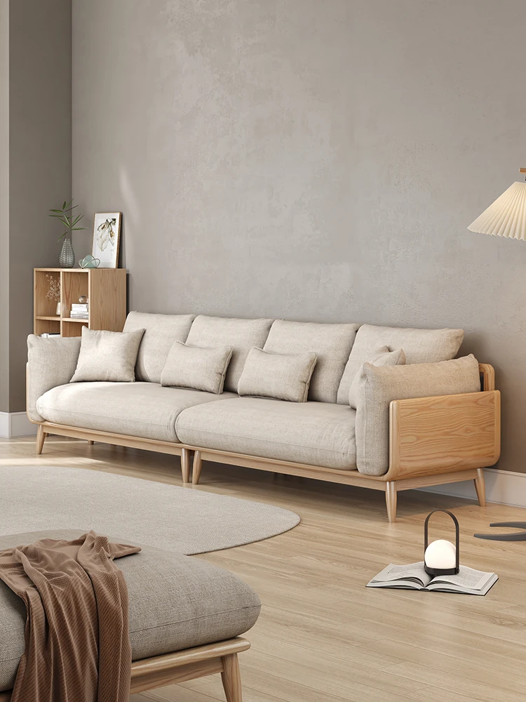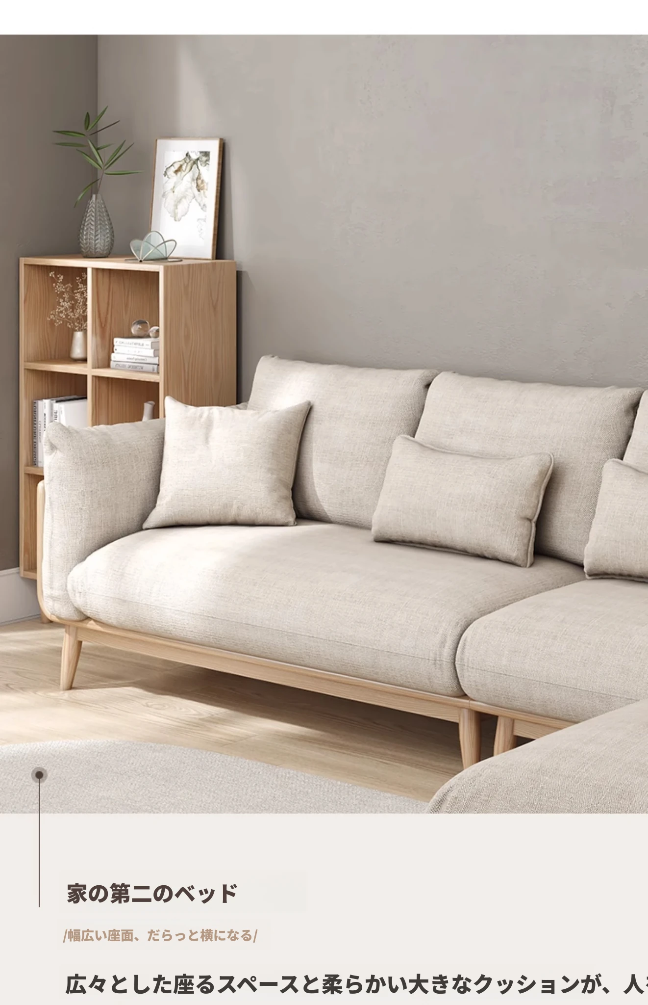 北欧スタイルの天然木製ファブリックソファ | モダンミニマリズム | テクノロジー布使用 | 小型リビングに最適 | ホワイトアッシュ材の3人掛けコンビネーションソファ