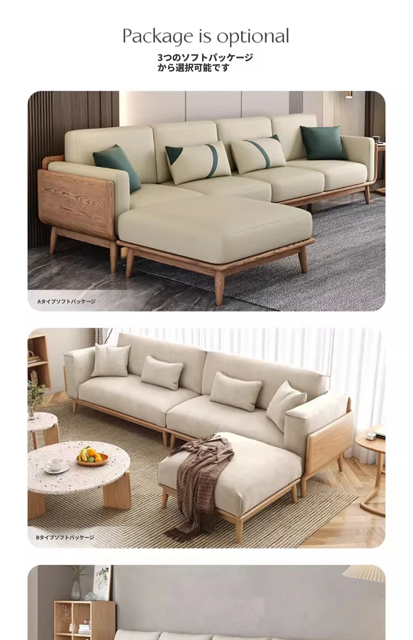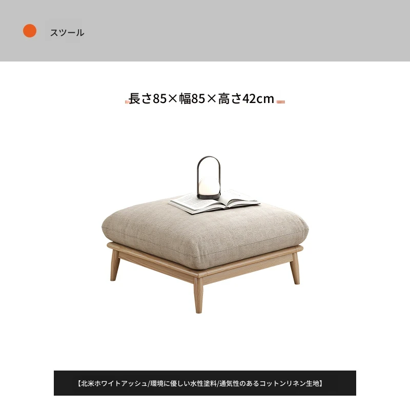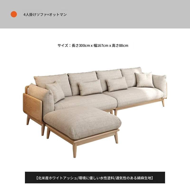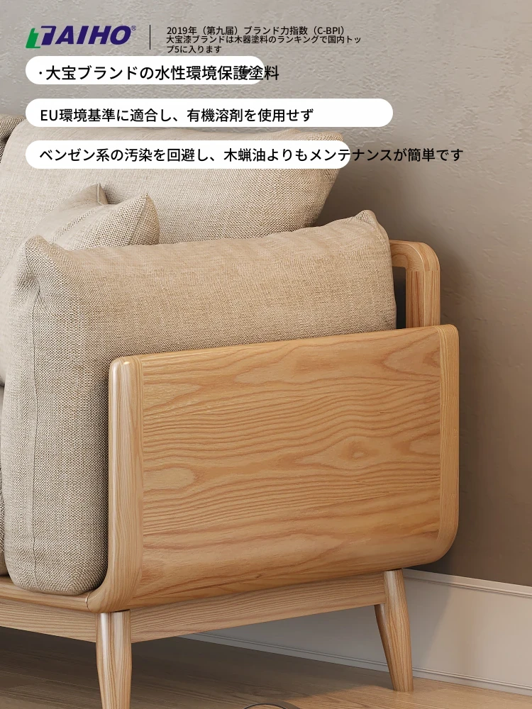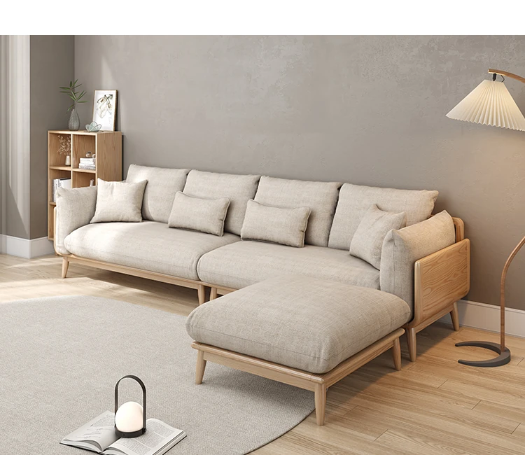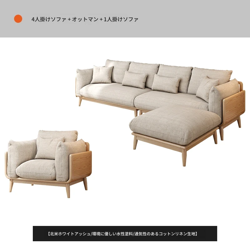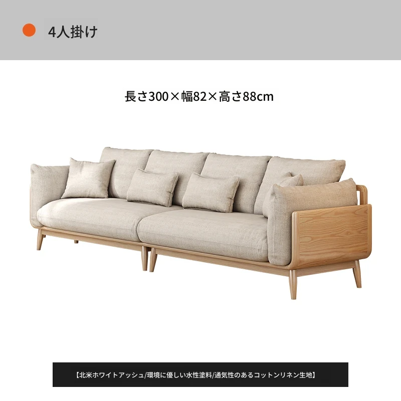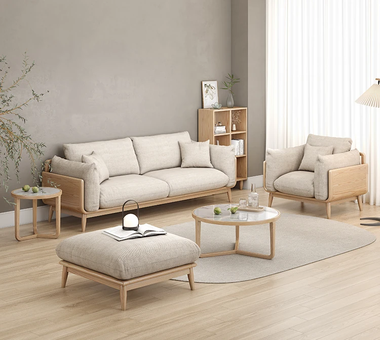 北欧スタイルの天然木製ファブリックソファ | モダンミニマリズム | テクノロジー布使用 | 小型リビングに最適 | ホワイトアッシュ材の3人掛けコンビネーションソファ