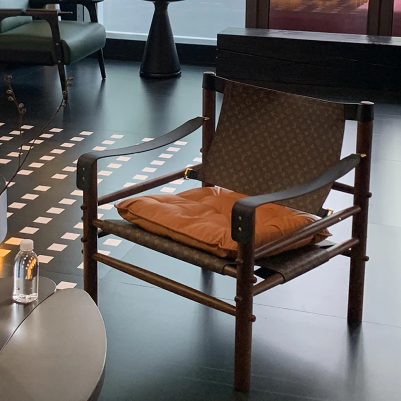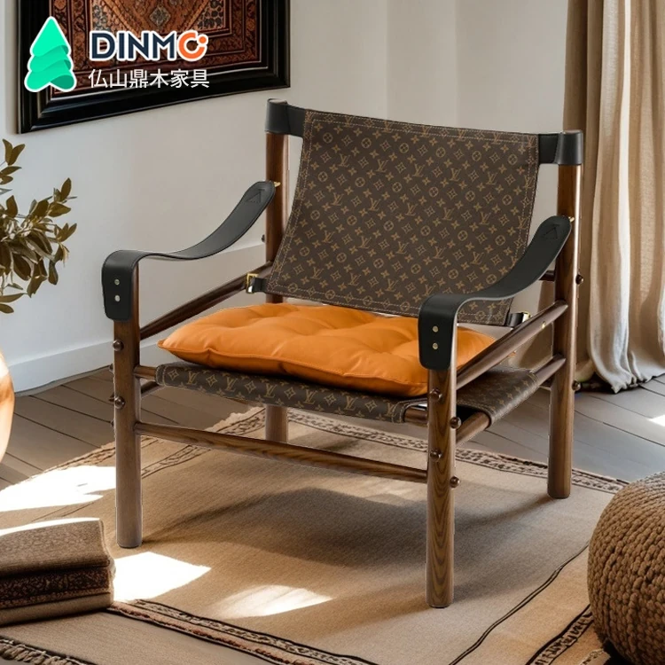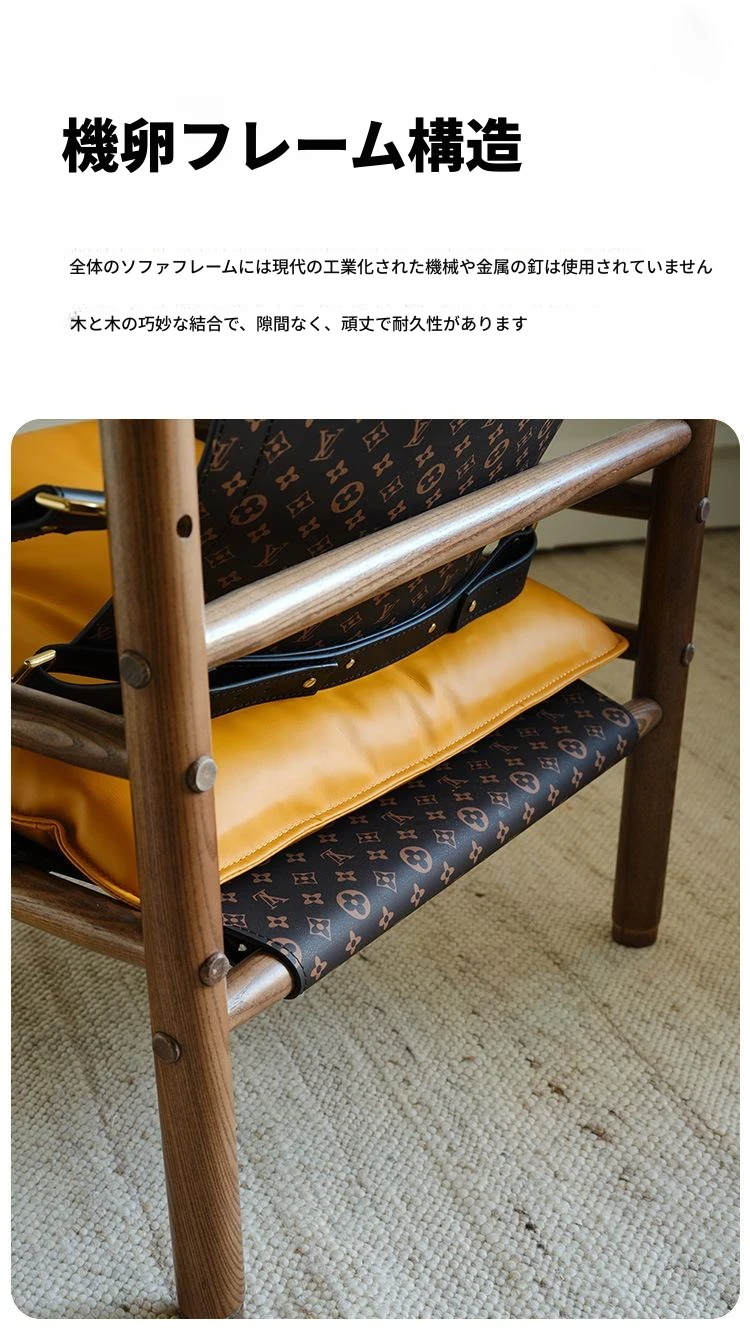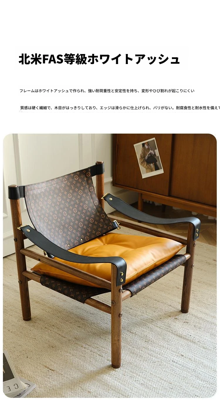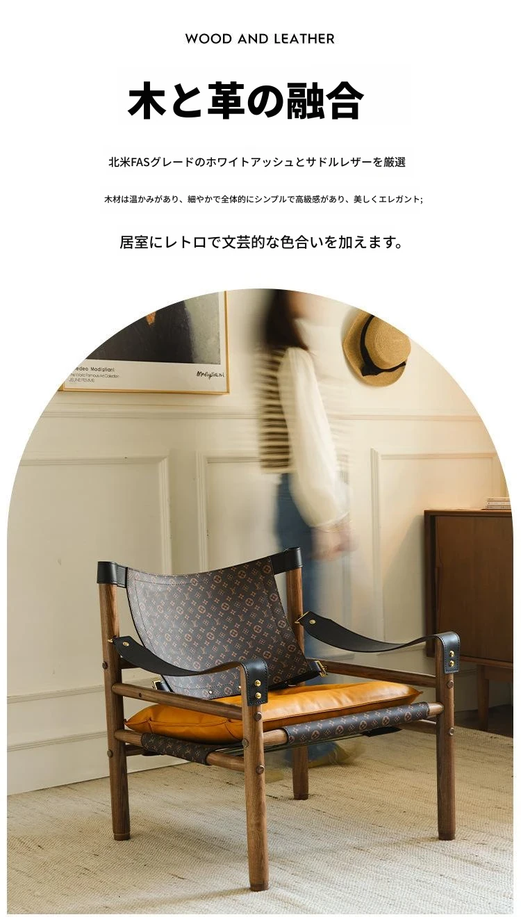 北欧スタイルの無垢材ヴィンテージソファチェア - デザイナーの創造力溢れるホテル宿泊施設向け、リラックスできるサドルレザー印刷ハンティングチェア。快適さとスタイルを兼ね備えた一品!
