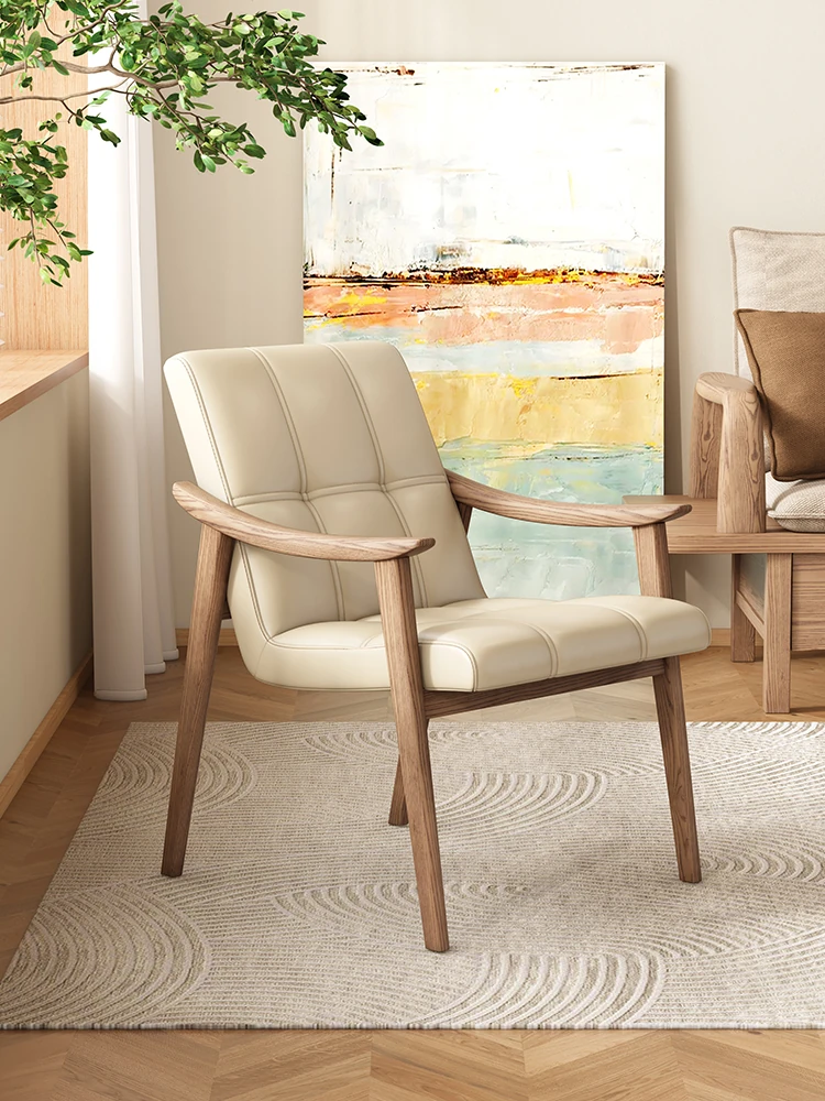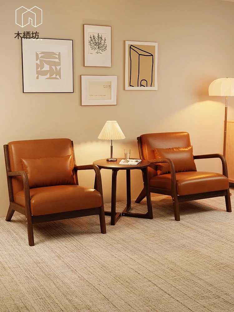 本革製北欧スタイル一人掛けソファー - 新作!リビングやバルコニーにぴったりな実木製のレトロデザインの小さなソファとテーブルセット。あなたのインテリアに温かみを加え、リラックスできる空間を演出します!